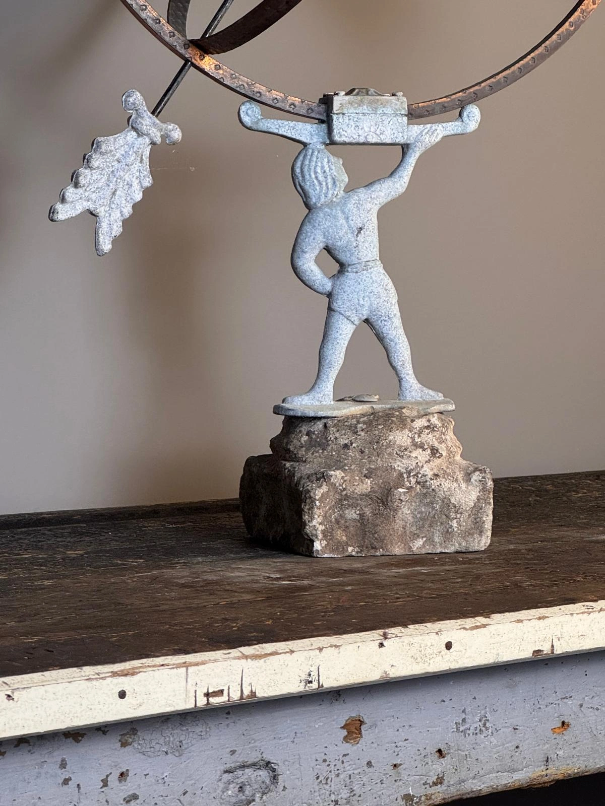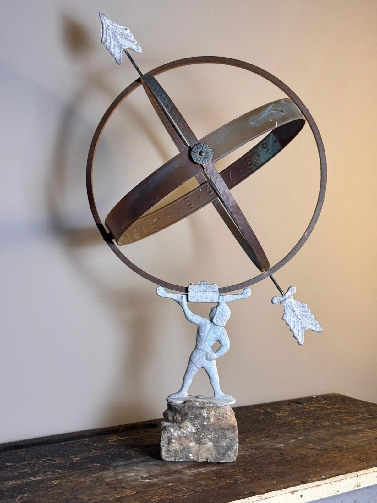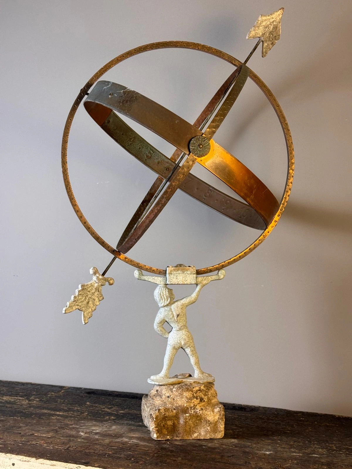 Escultura decorativa inspirada en una esfera armilar, realizada en metal patinado, con aros graduados y flecha direccional. El conjunto se apoya sobre una figura masculina de inspiración clásica, tratada de manera esquemática, que sostiene la estructura en actitud simbólica, evocando la idea del esfuerzo humano frente al conocimiento y el orden del cosmos.