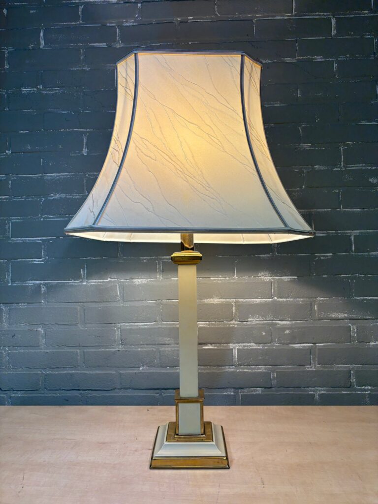 Hermosa lámpara de mesa en estilo Mid-Century, realizada en latón en combinación con acero cromado negro.