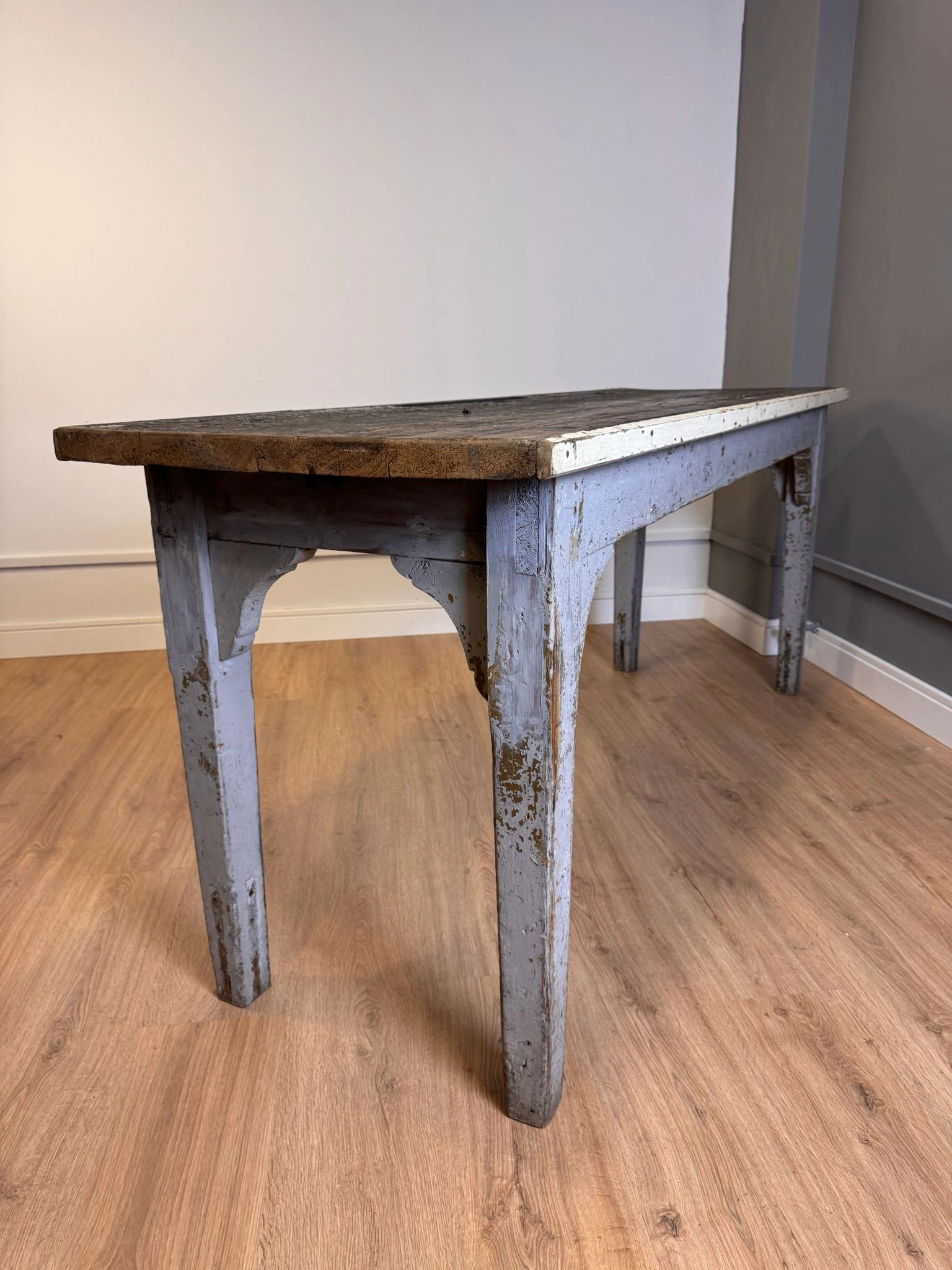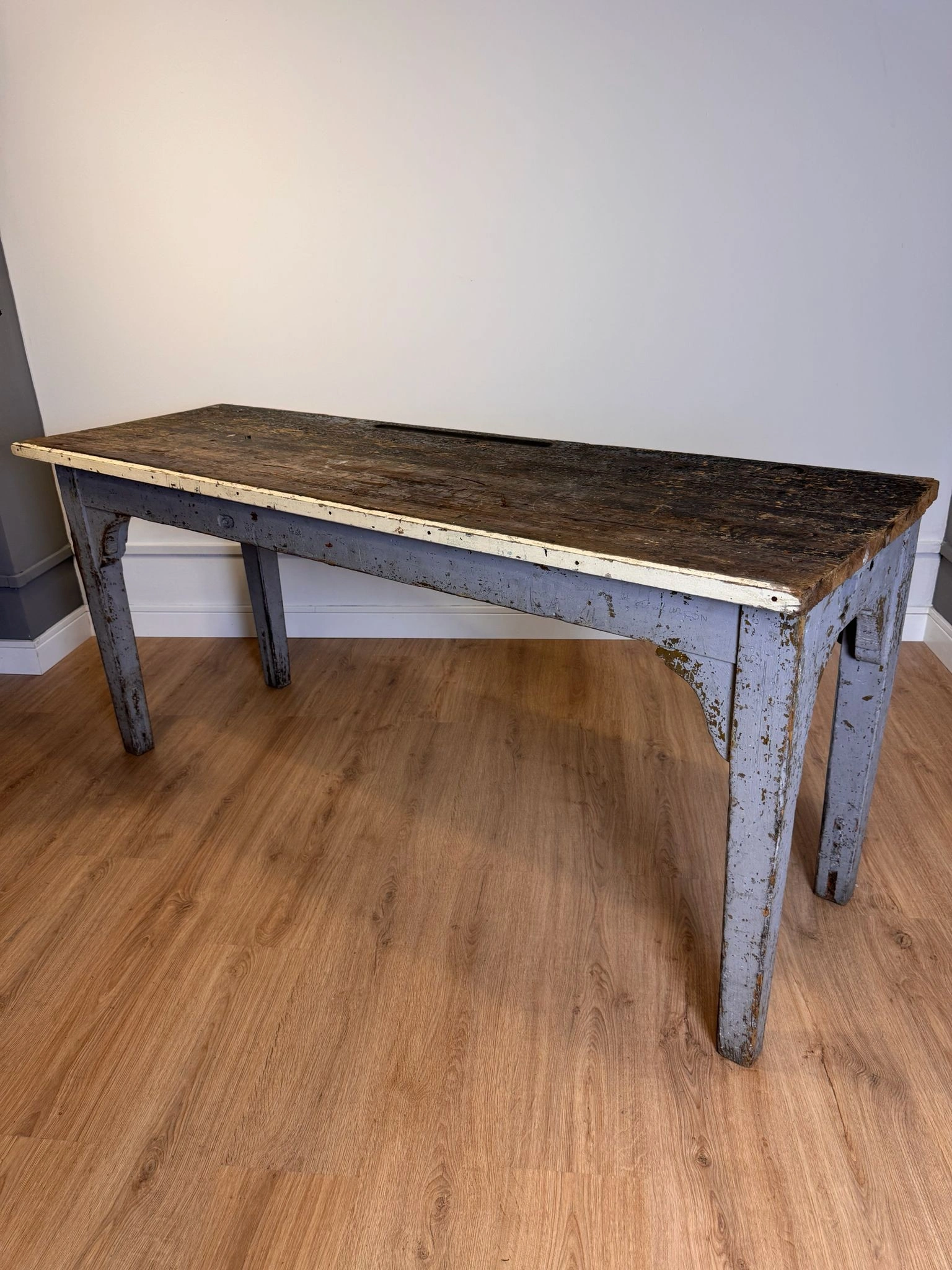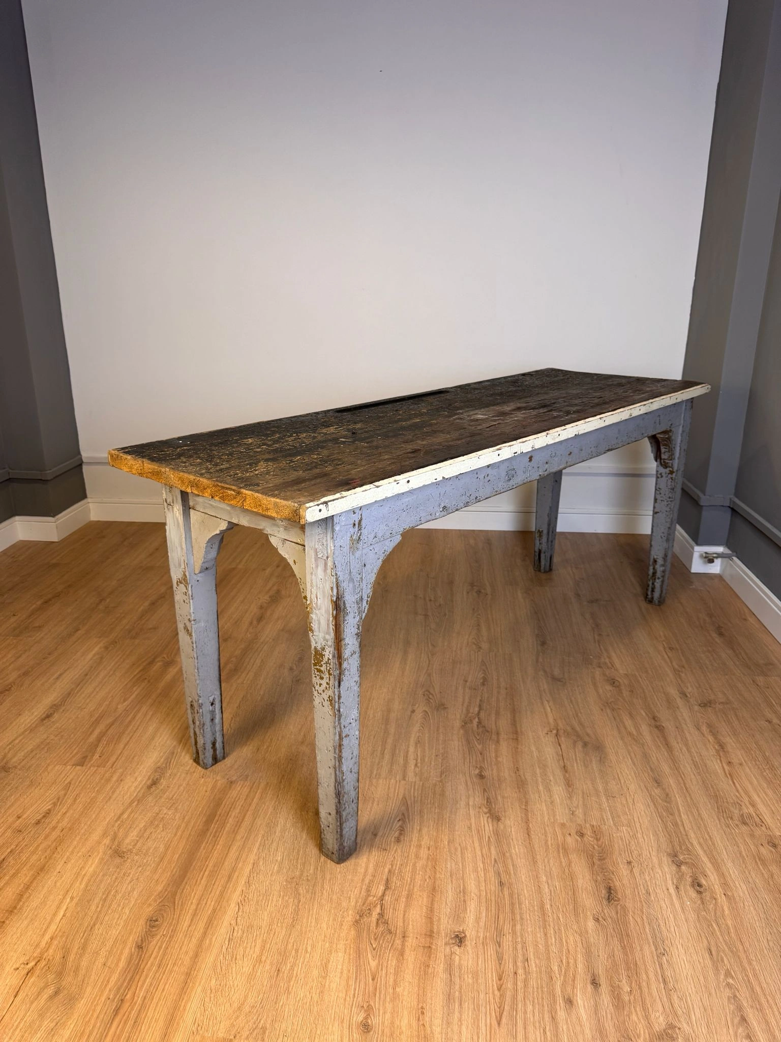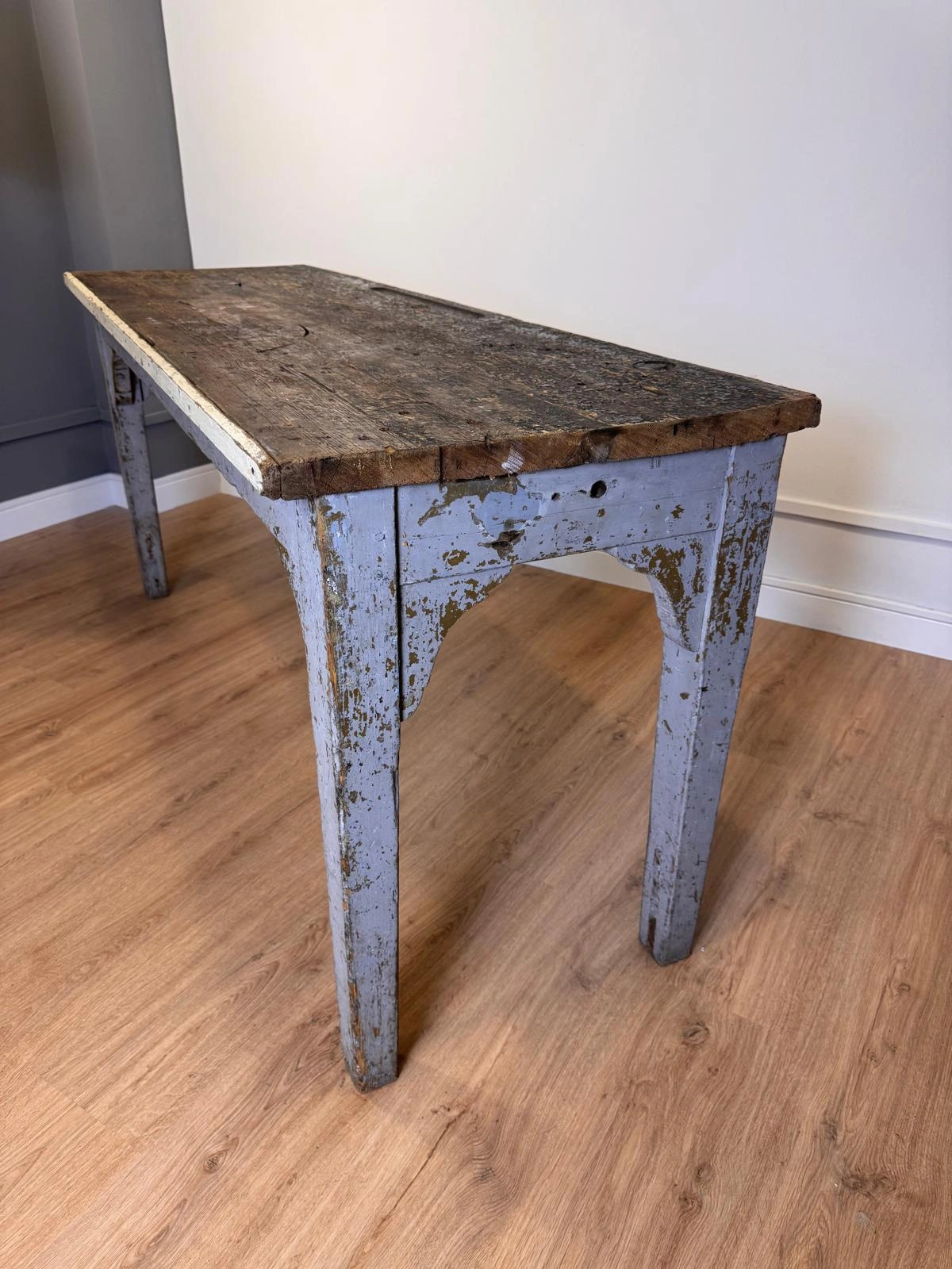 Mesa de laboratorio o mesa de trabajo técnico, con grueso tablero formado por tablas ensambladas y estructura robusta pintada originalmente en gris azulado.