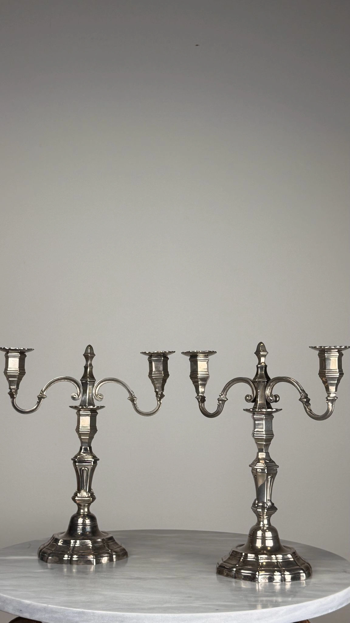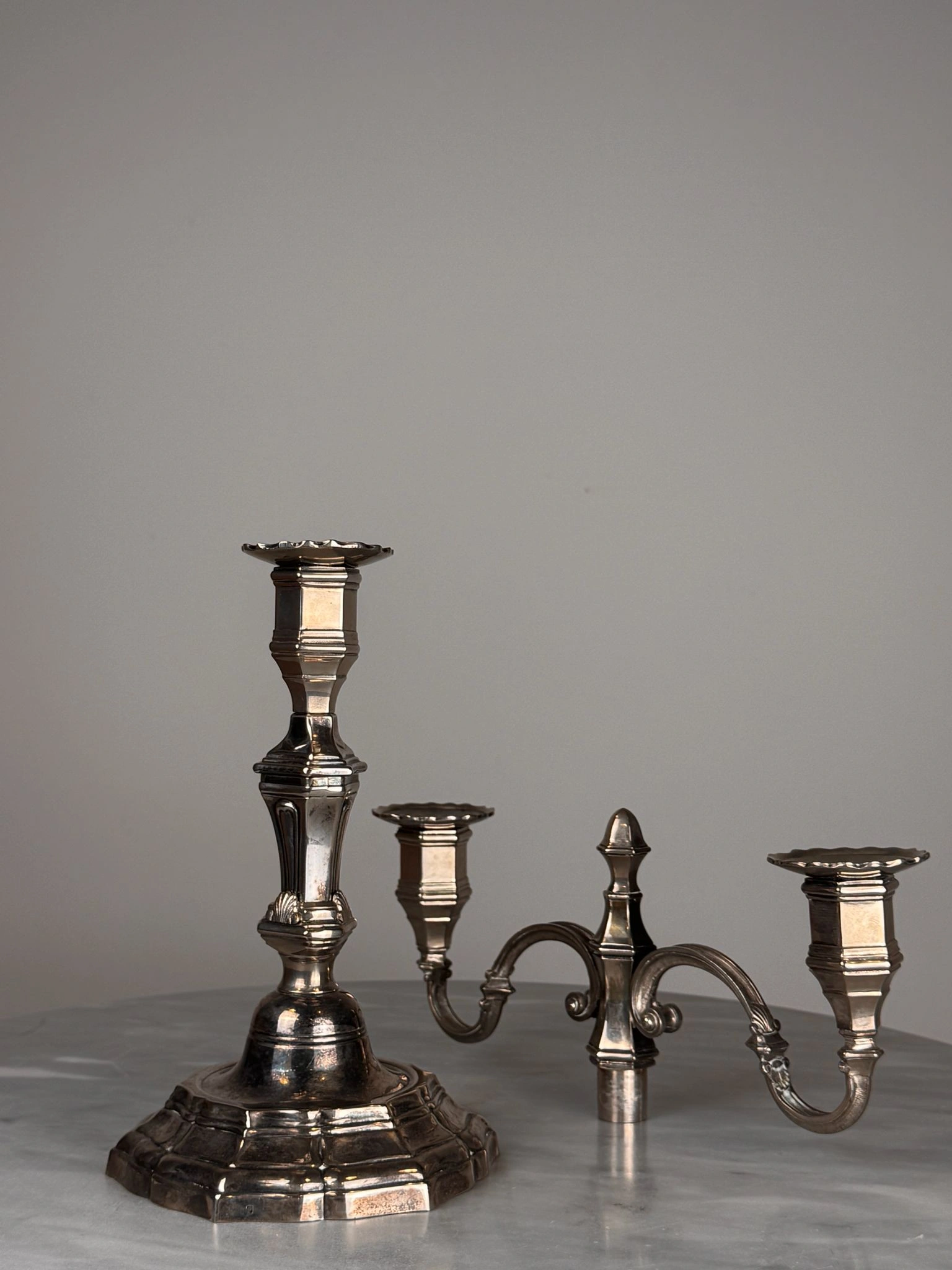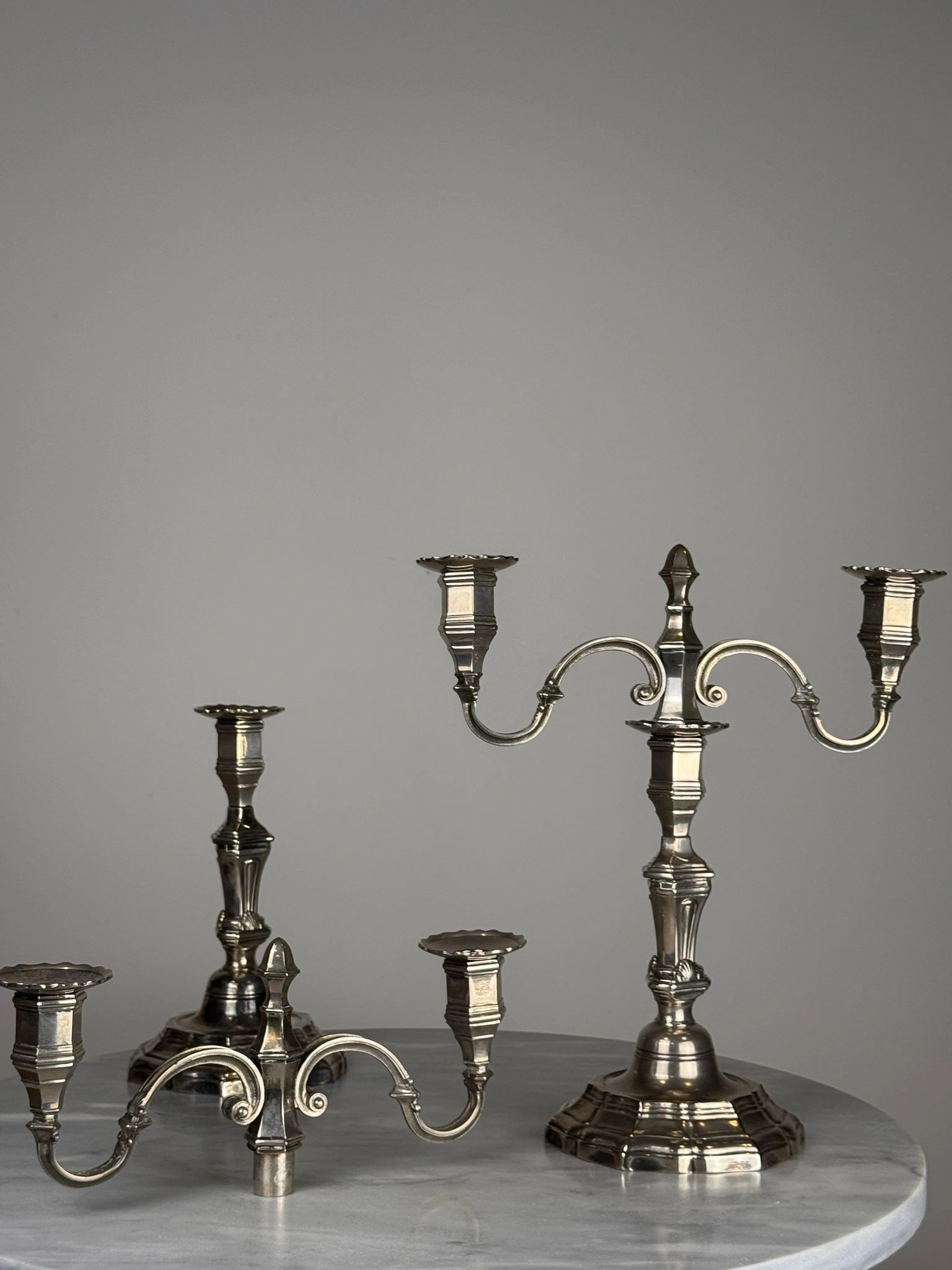Pareja de candelabros de mesa realizados en metal plateado, concebidos con un sistema modular que permite su uso tanto como candeleros individuales como en formato de dos luces mediante un suplemento desmontable.