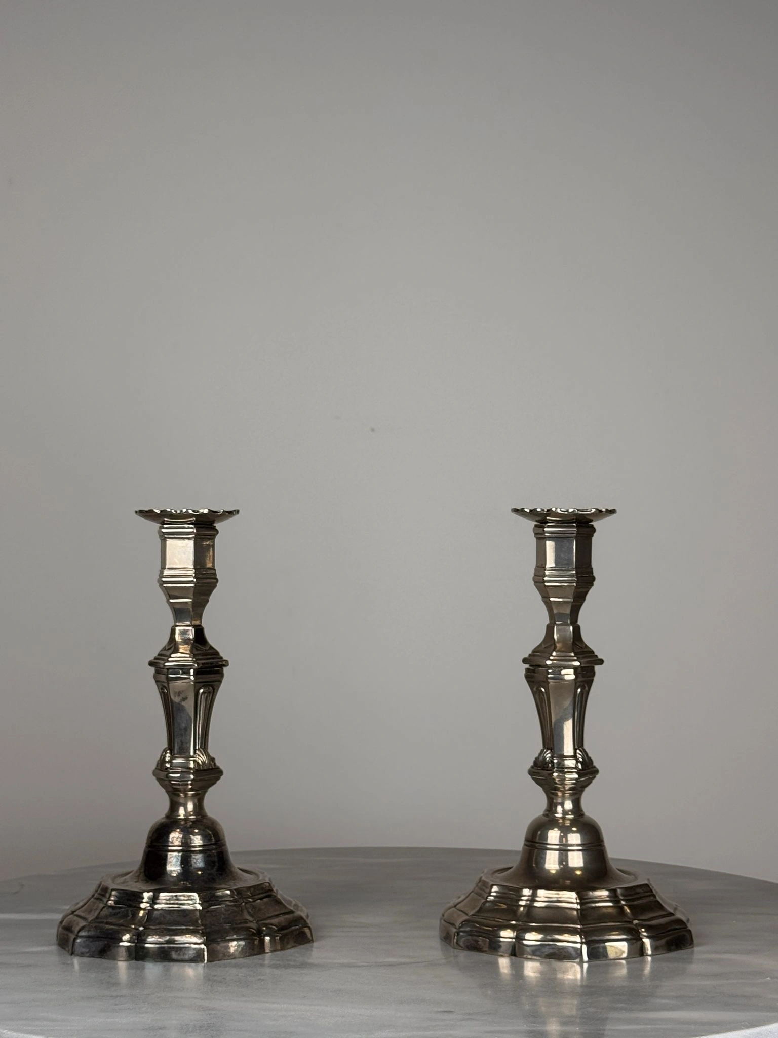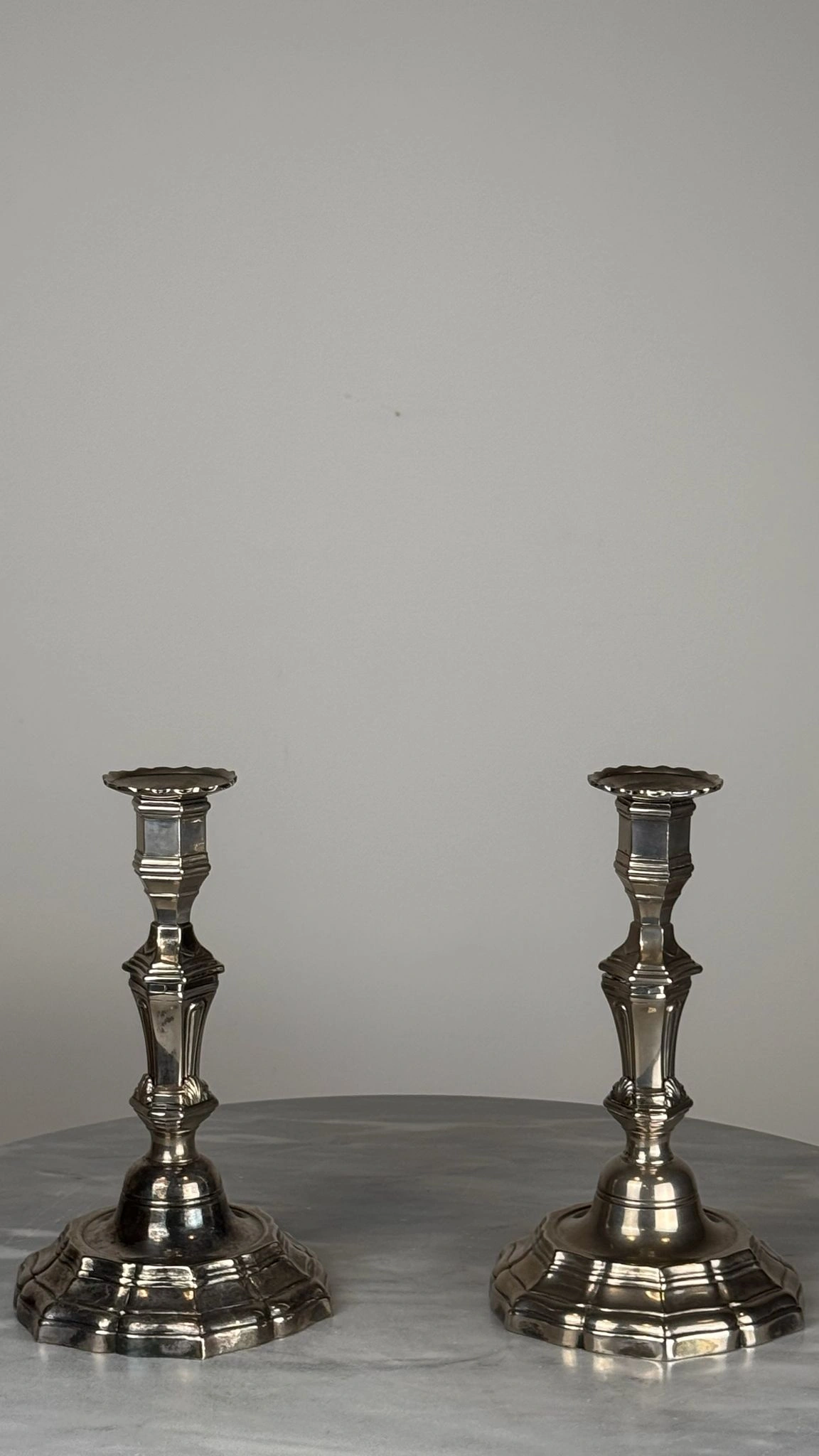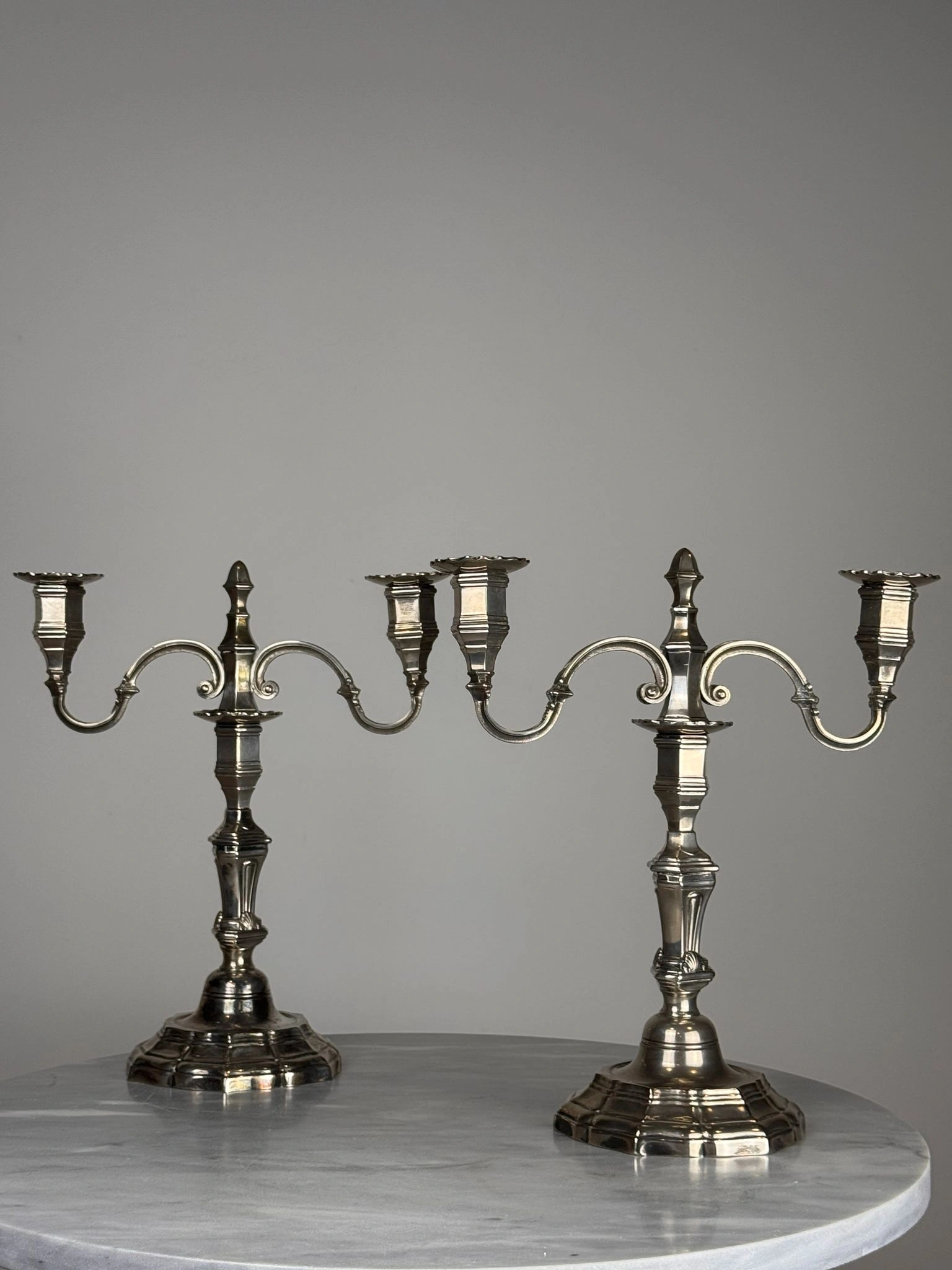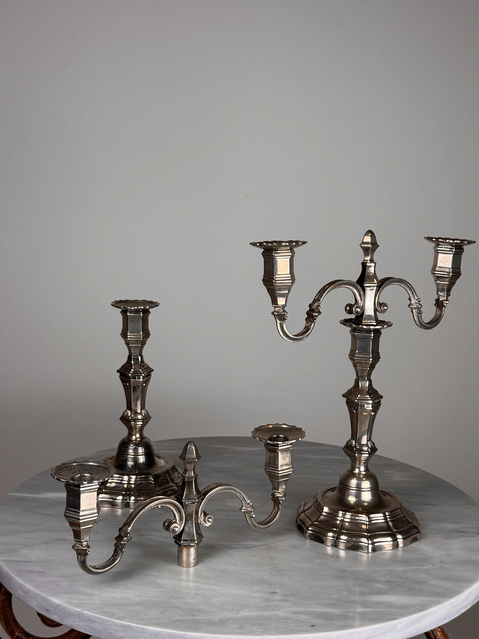 Pareja de candelabros de mesa realizados en metal plateado, concebidos con un sistema modular que permite su uso tanto como candeleros individuales como en formato de dos luces mediante un suplemento desmontable.