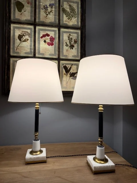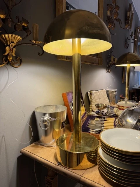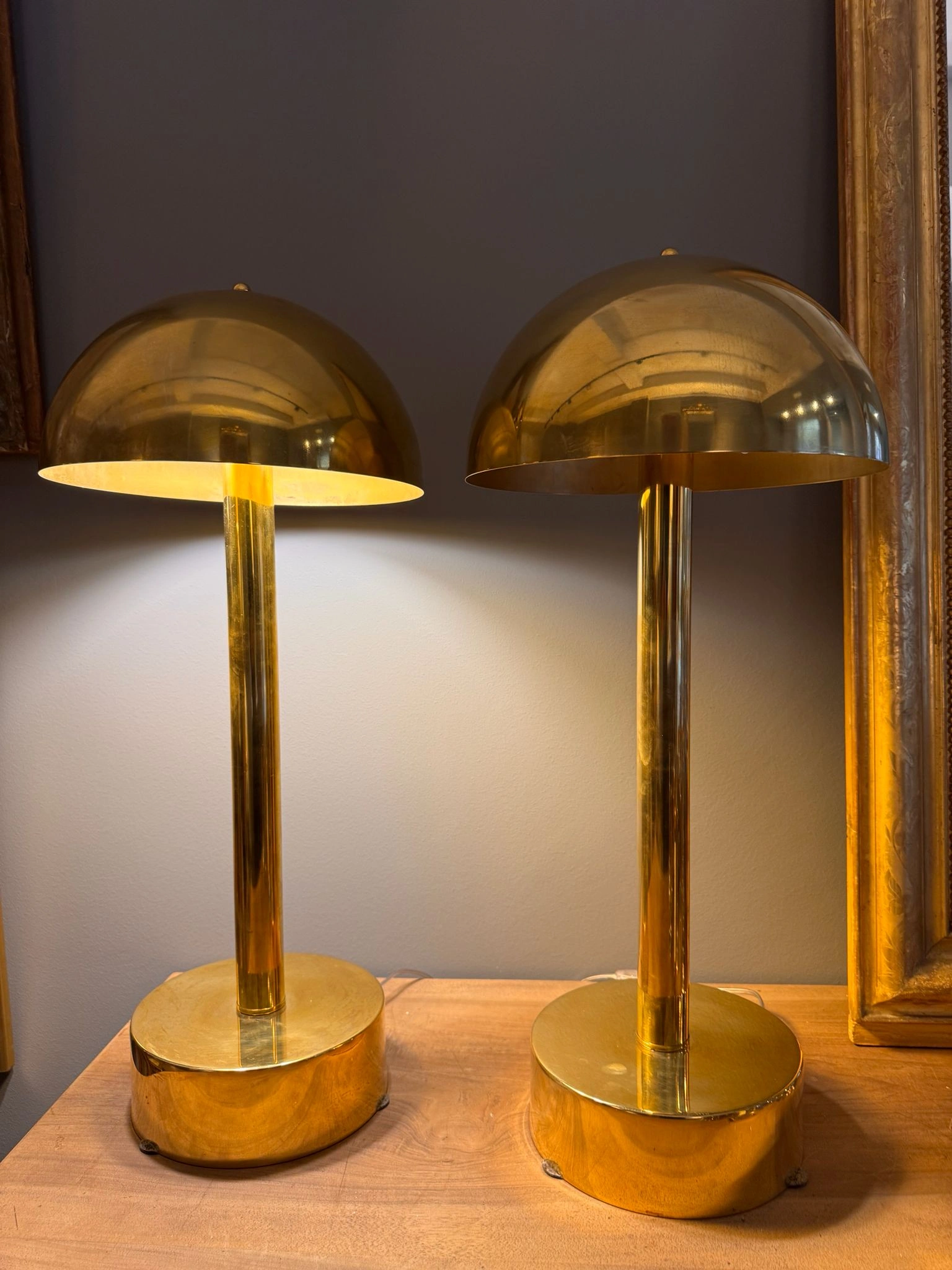 Pareja de lámparas italianas de los años 60–70 realizadas íntegramente en latón dorado, con pantalla metálica tipo cúpula (“mushroom”) y base circular de líneas puras. Su estética, propia del diseño Space Age italiano, combina modernidad, sofisticación y una luz cálida muy envolvente gracias al interior reflectante de la pantalla.
