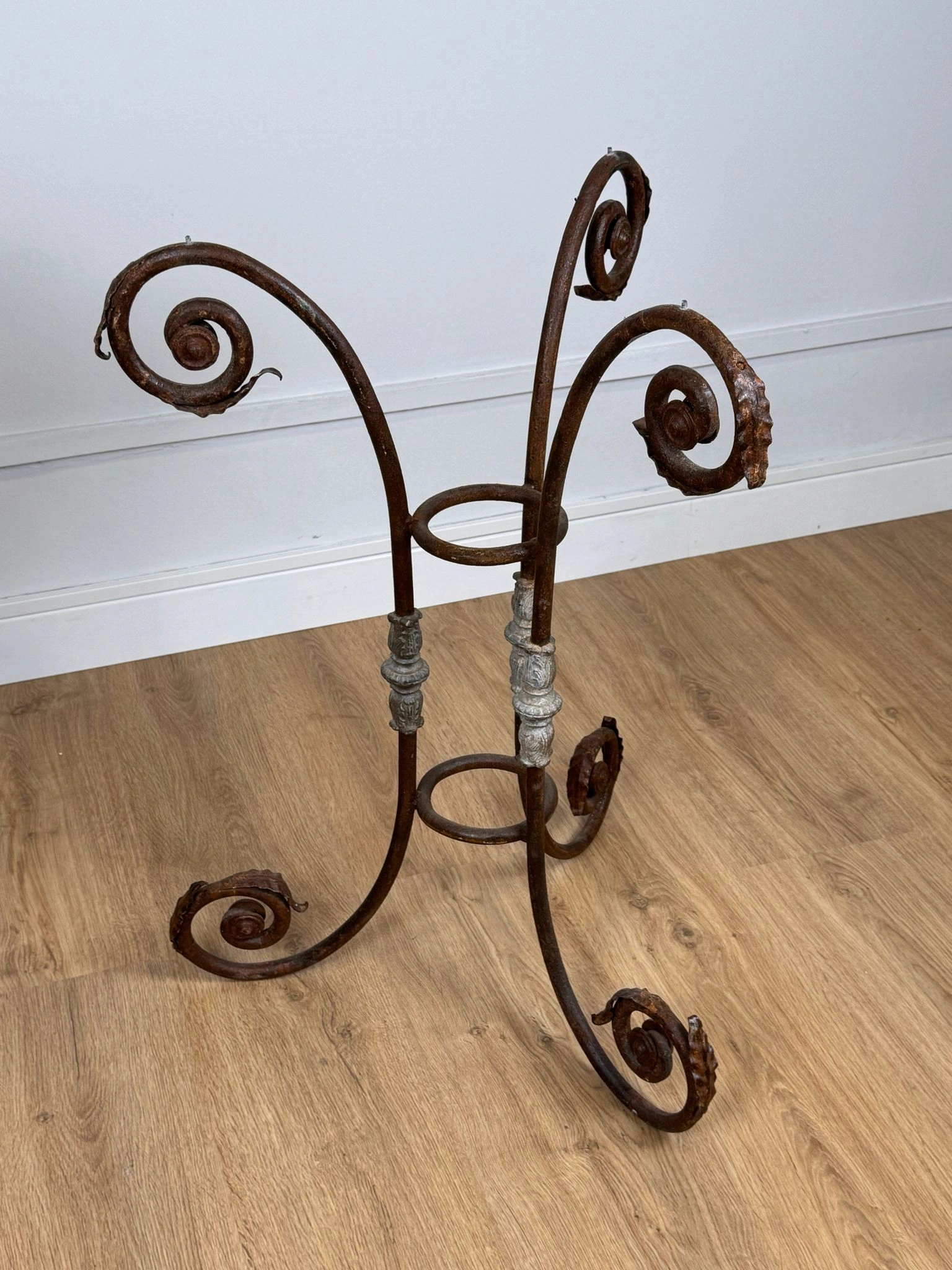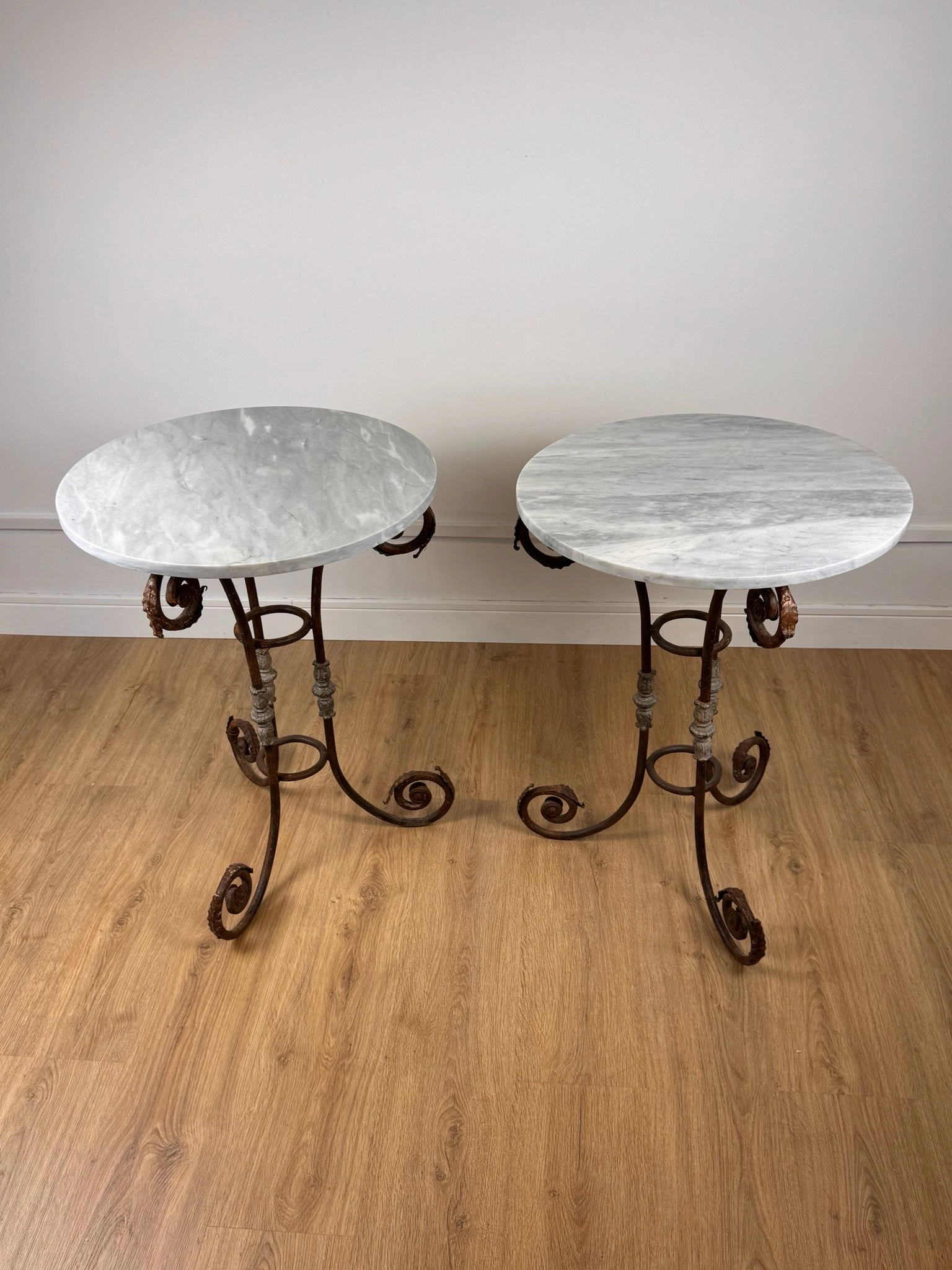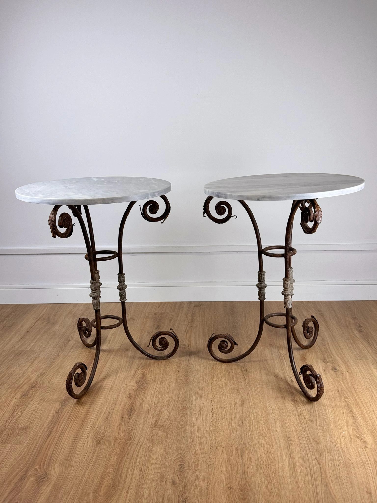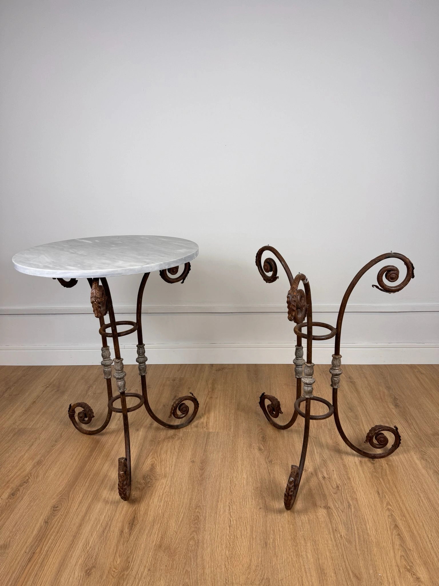 Cada pieza presenta un Sobre circular en mármol blanco veteado de Carrara, típico de la producción italiana de época, junto a una estructura de hierro forjado de gran carácter: tres patas arqueadas con volutas que se abren hacia fuera y columnillas decorativas moldeadas que confirman su ejecución artesanal de época.