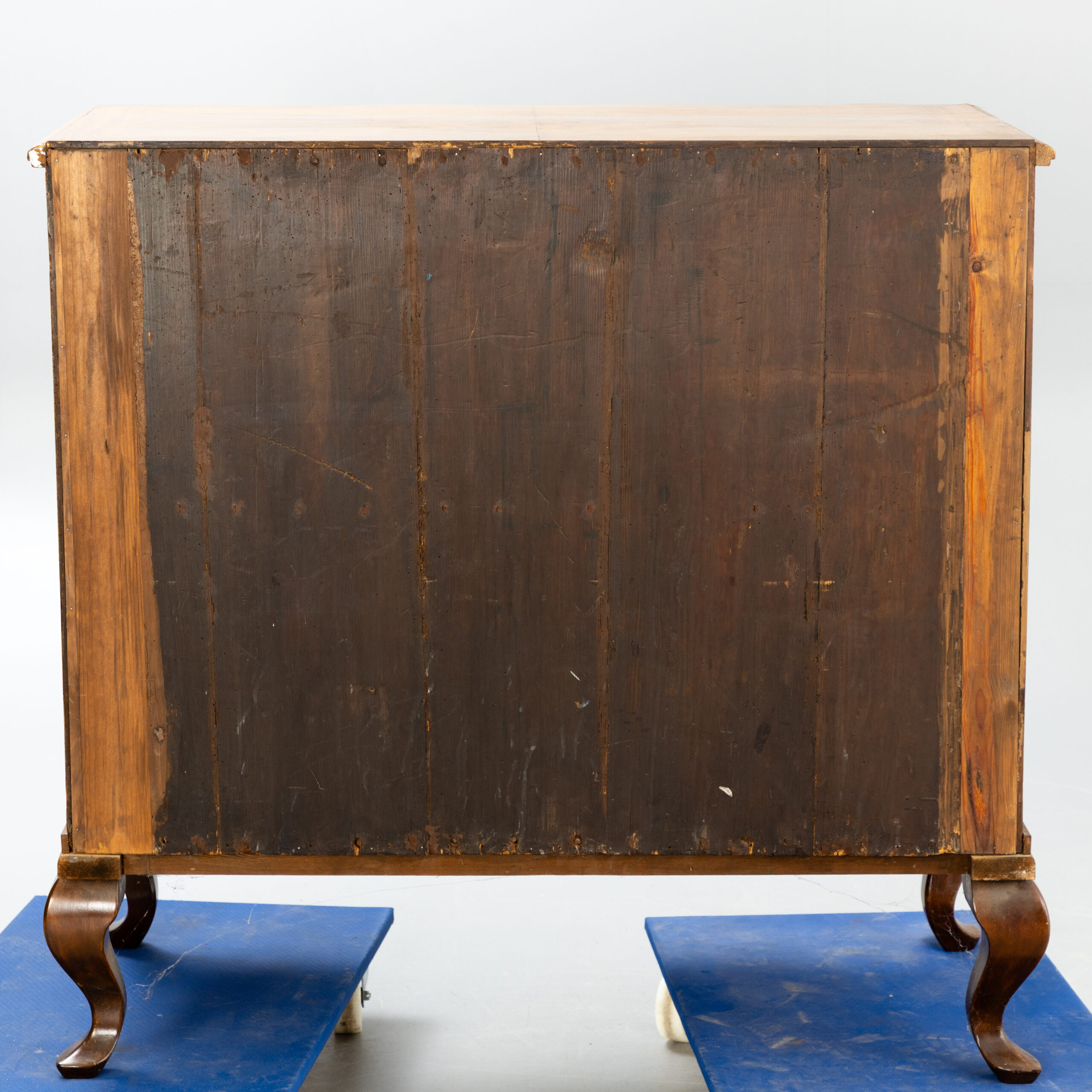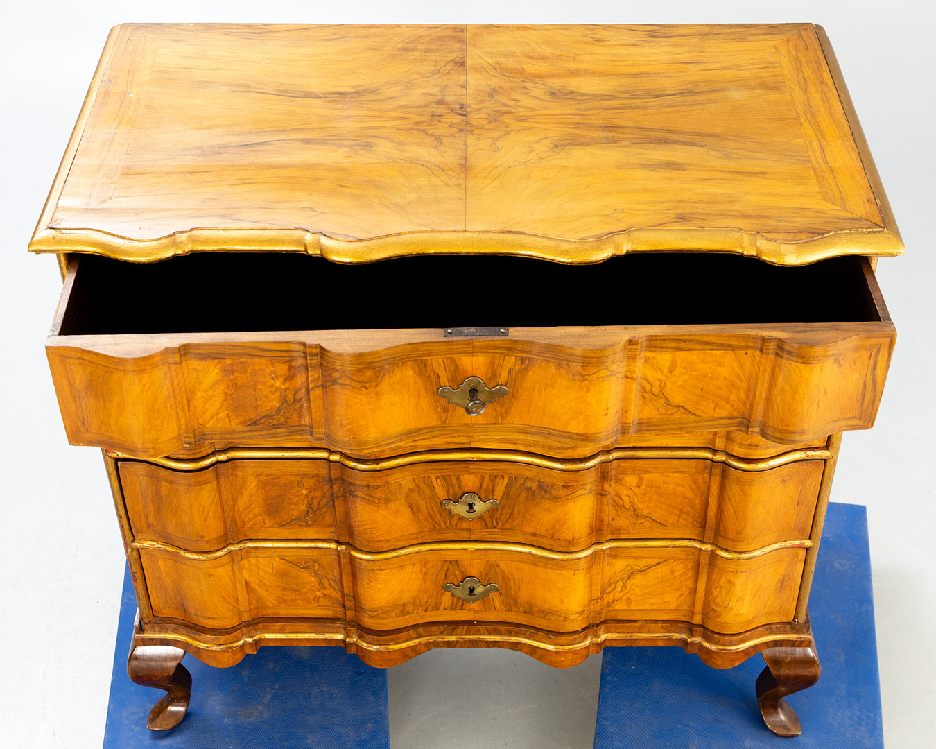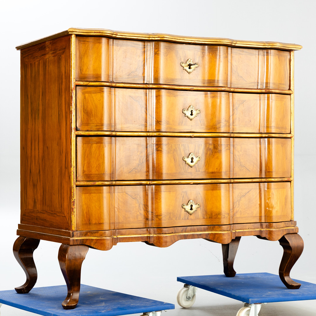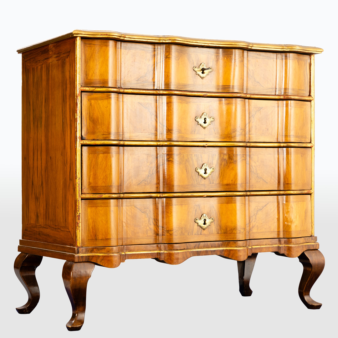 Soberbia cómoda sueca realizada en madera de nogal con estructura en coníferas, concebida en estilo rococó con el característico frente ondulado en espejo. Presenta cuatro amplios cajones perfilados con molduras doradas, rematados con bocallaves ornamentadas y cerraduras originales.