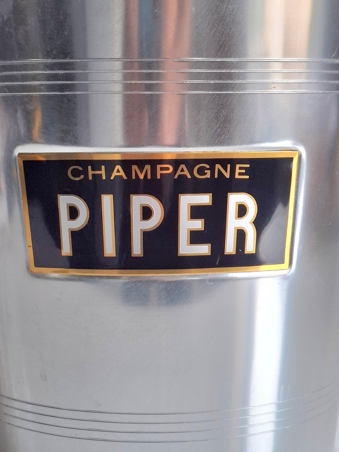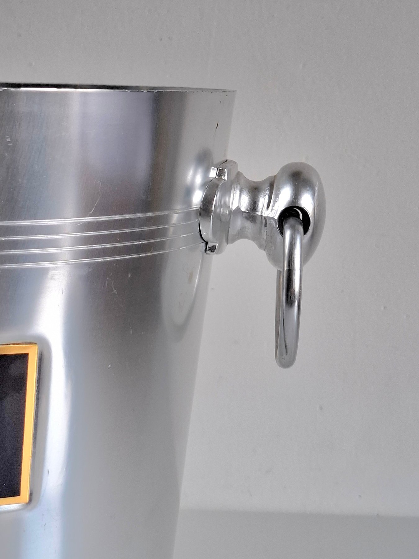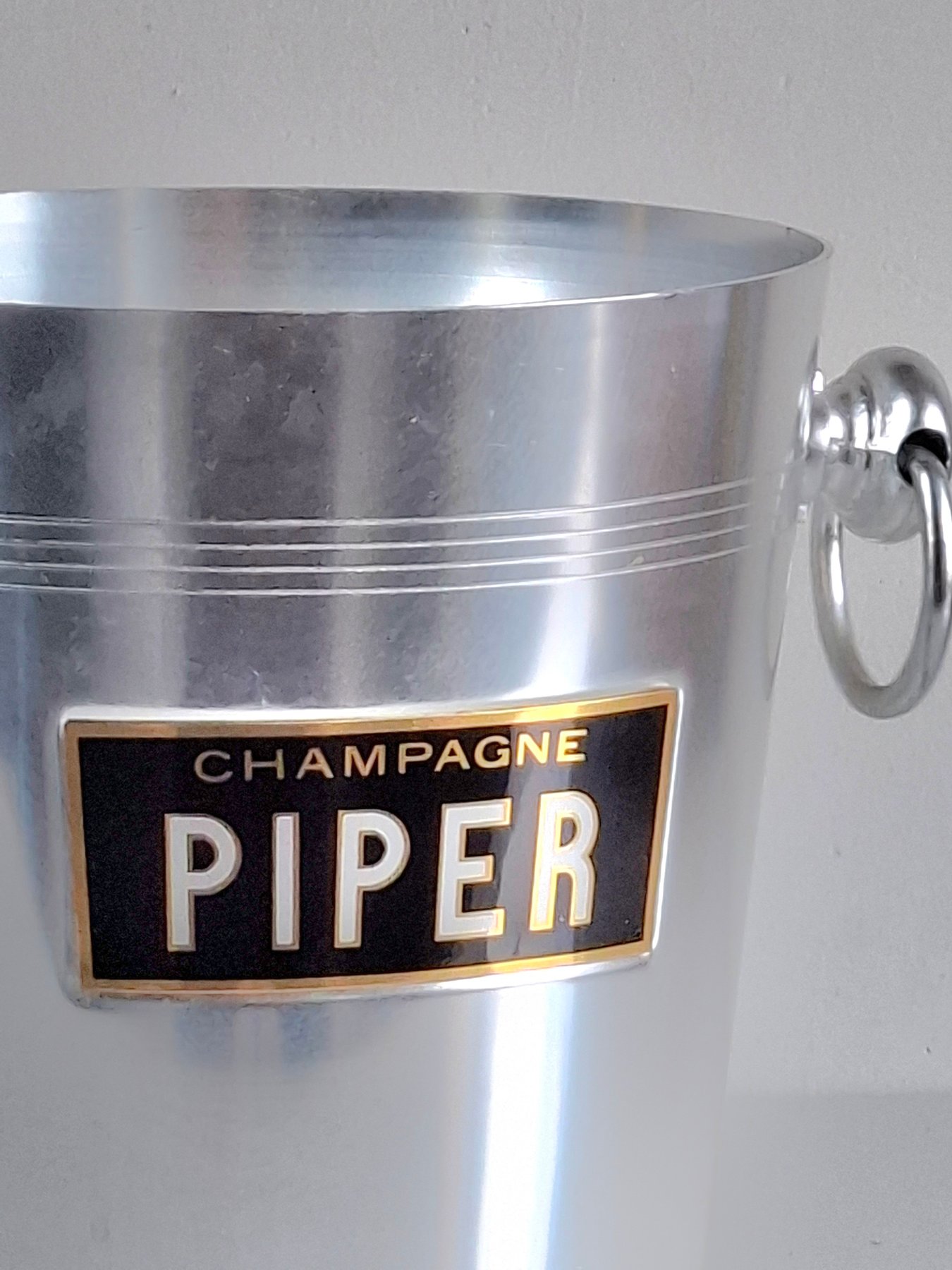 Elegante enfriador de champán de aluminio con acabado plateado, producido en Francia para la célebre casa Piper. Su diseño sobrio y funcional, realzado con anillas decorativas y asas laterales en forma de anilla, combina estética clásica con un carácter práctico. Una pieza decorativa con auténtico espíritu francés, ideal tanto para su uso en mesa como como elemento decorativo en interiores contemporáneos o vintage.
