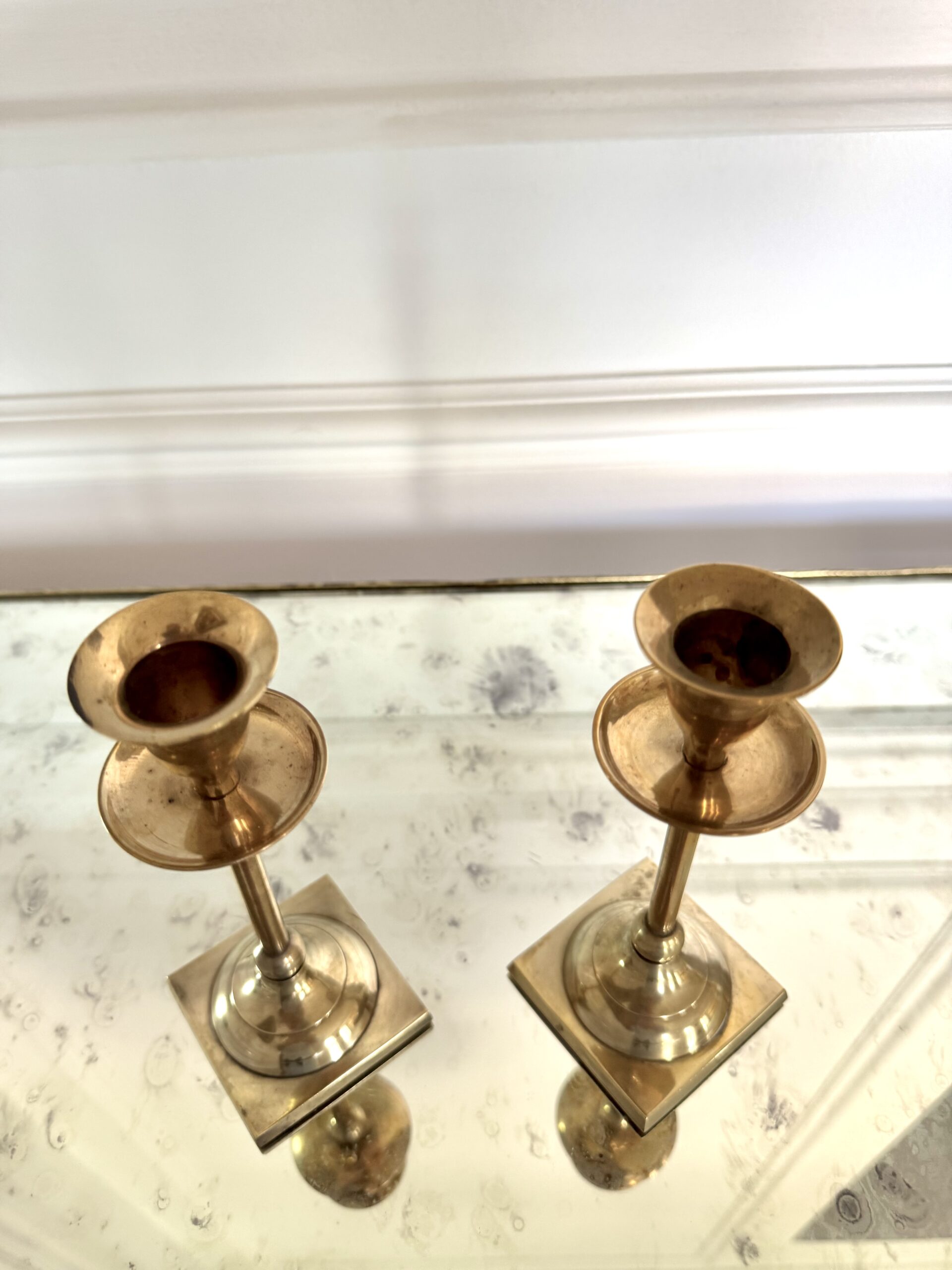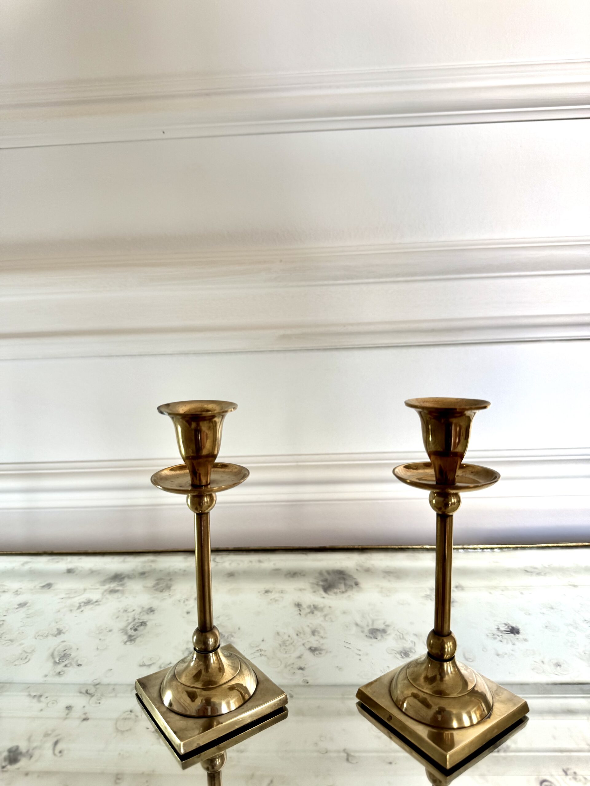 Elegante par de candelabros en latón pulido, de diseño clásico reinterpretado a mediados del siglo XX.