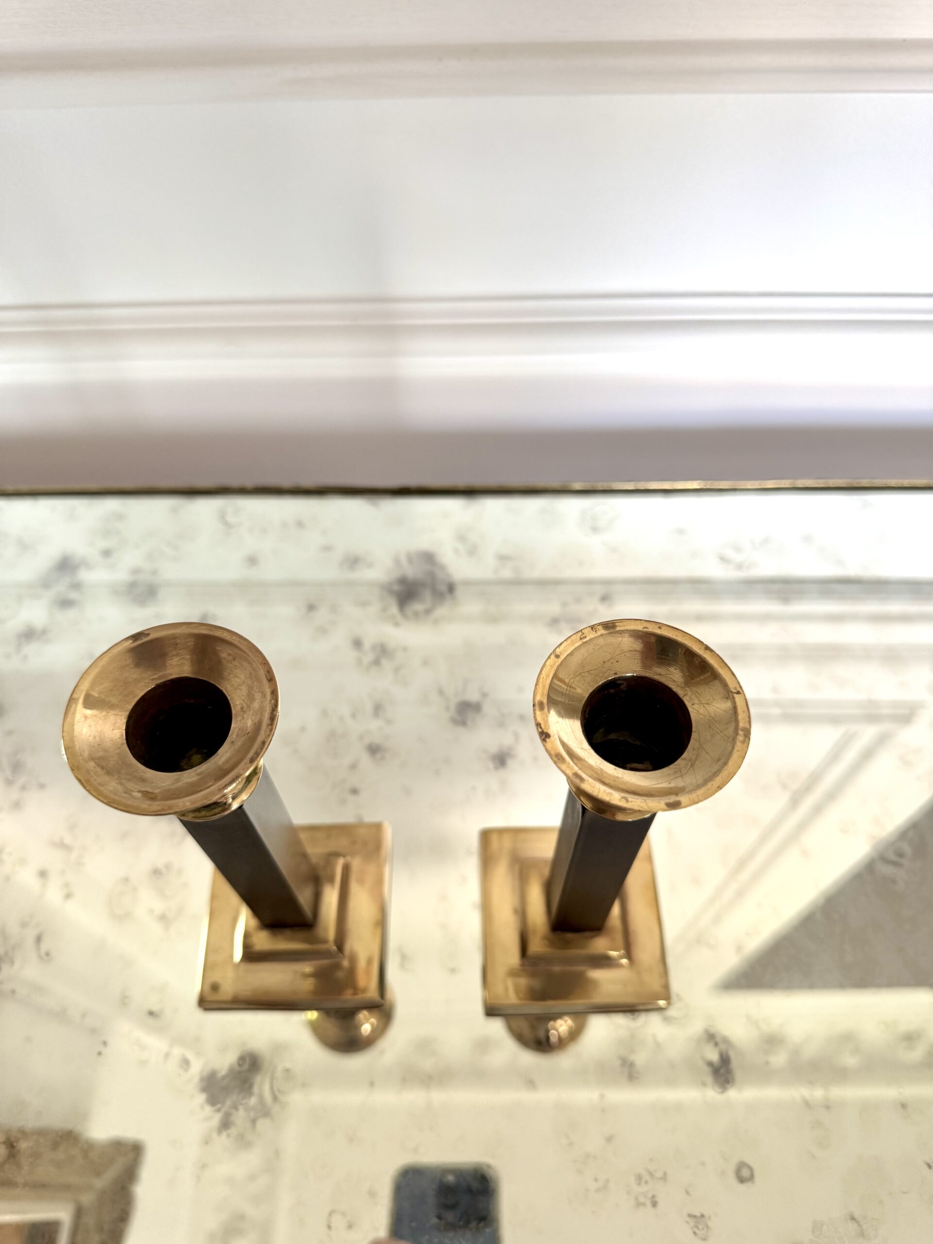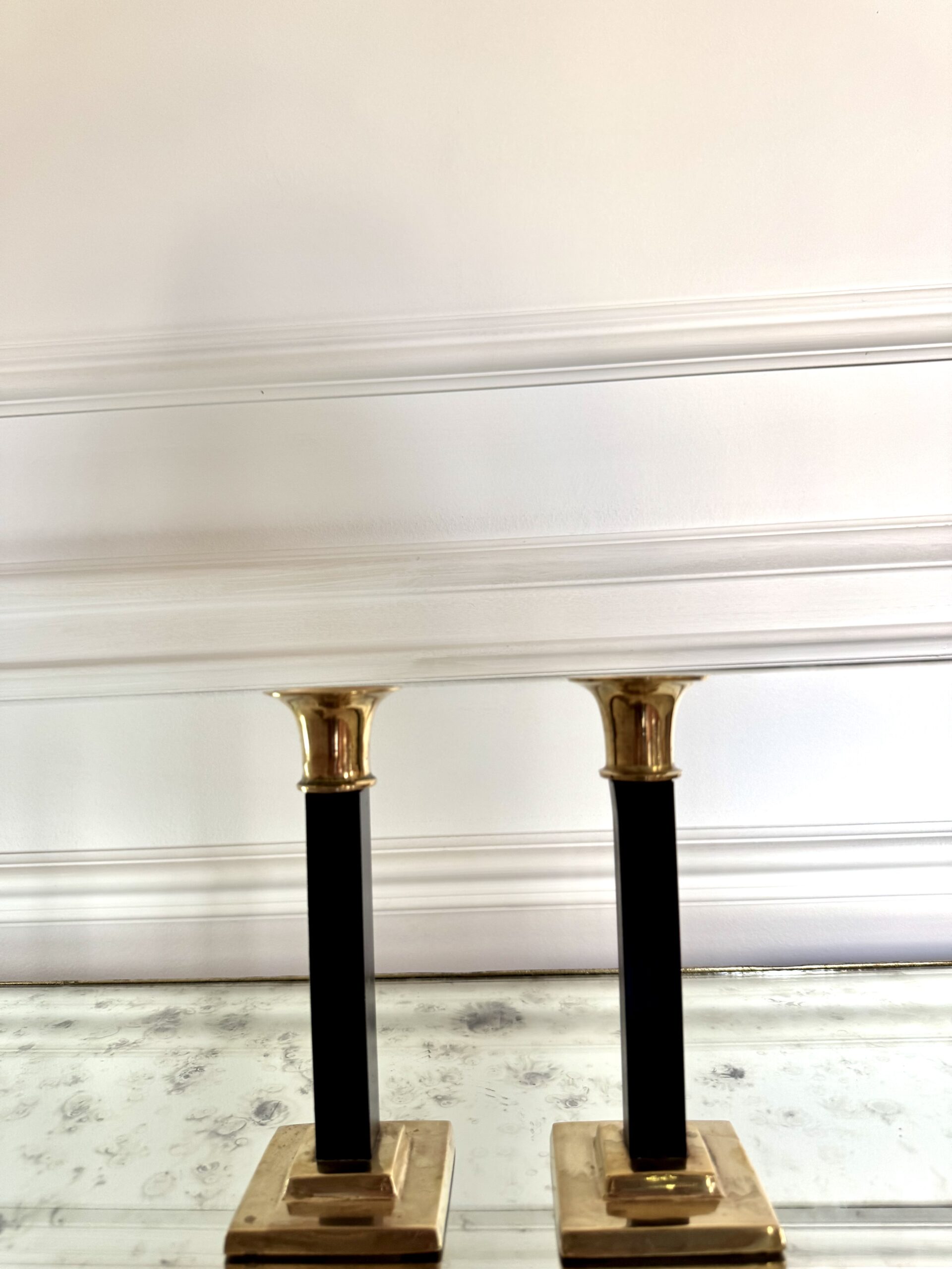 Par de candelabros con base cuadrada en latón pulido y fuste lacado en negro con sección cuadrada. Su forma simple y equilibrada, con el contraste entre el latón y el negro, los convierte en un complemento decorativo fácil de combinar en distintos espacios.