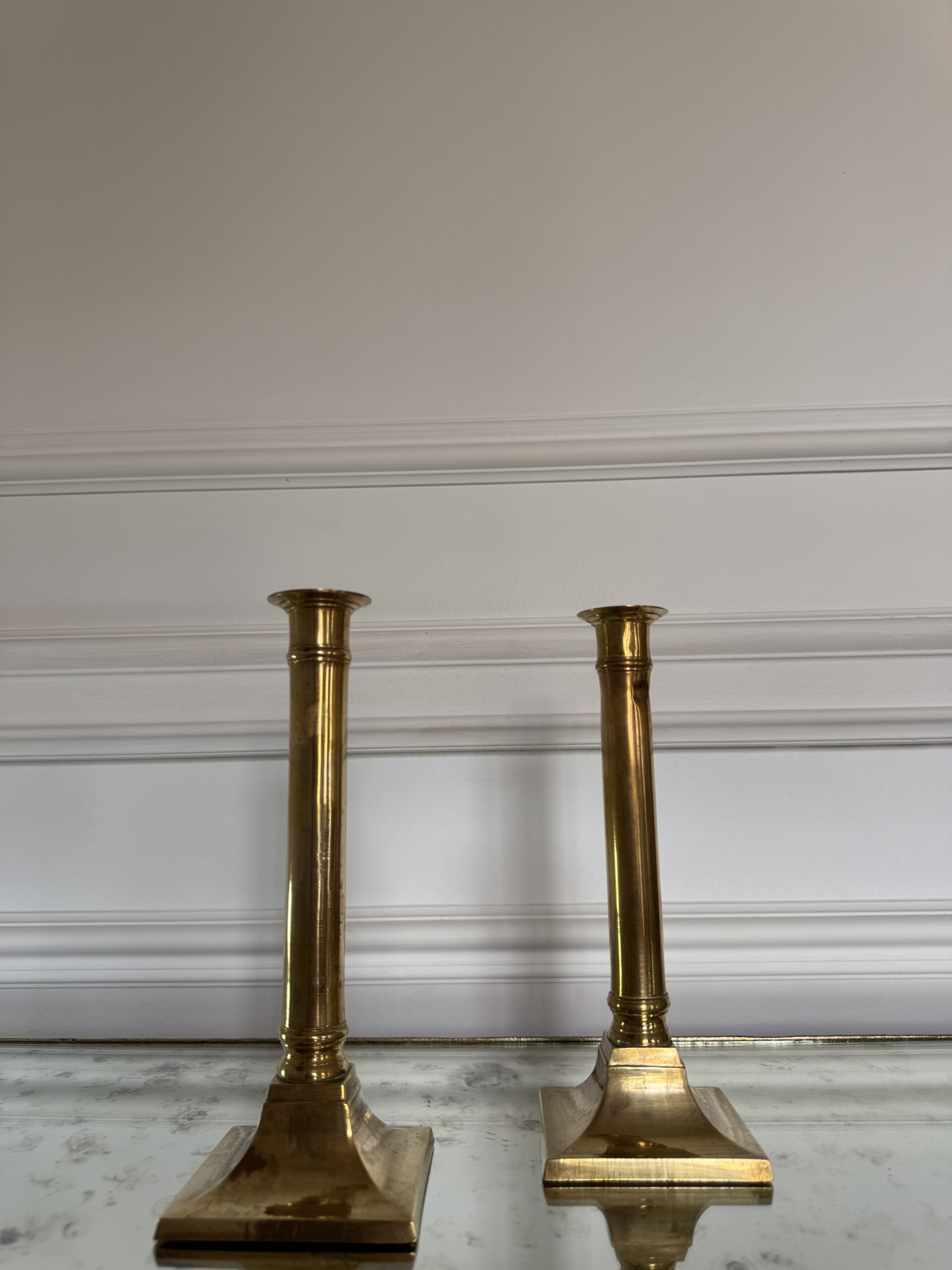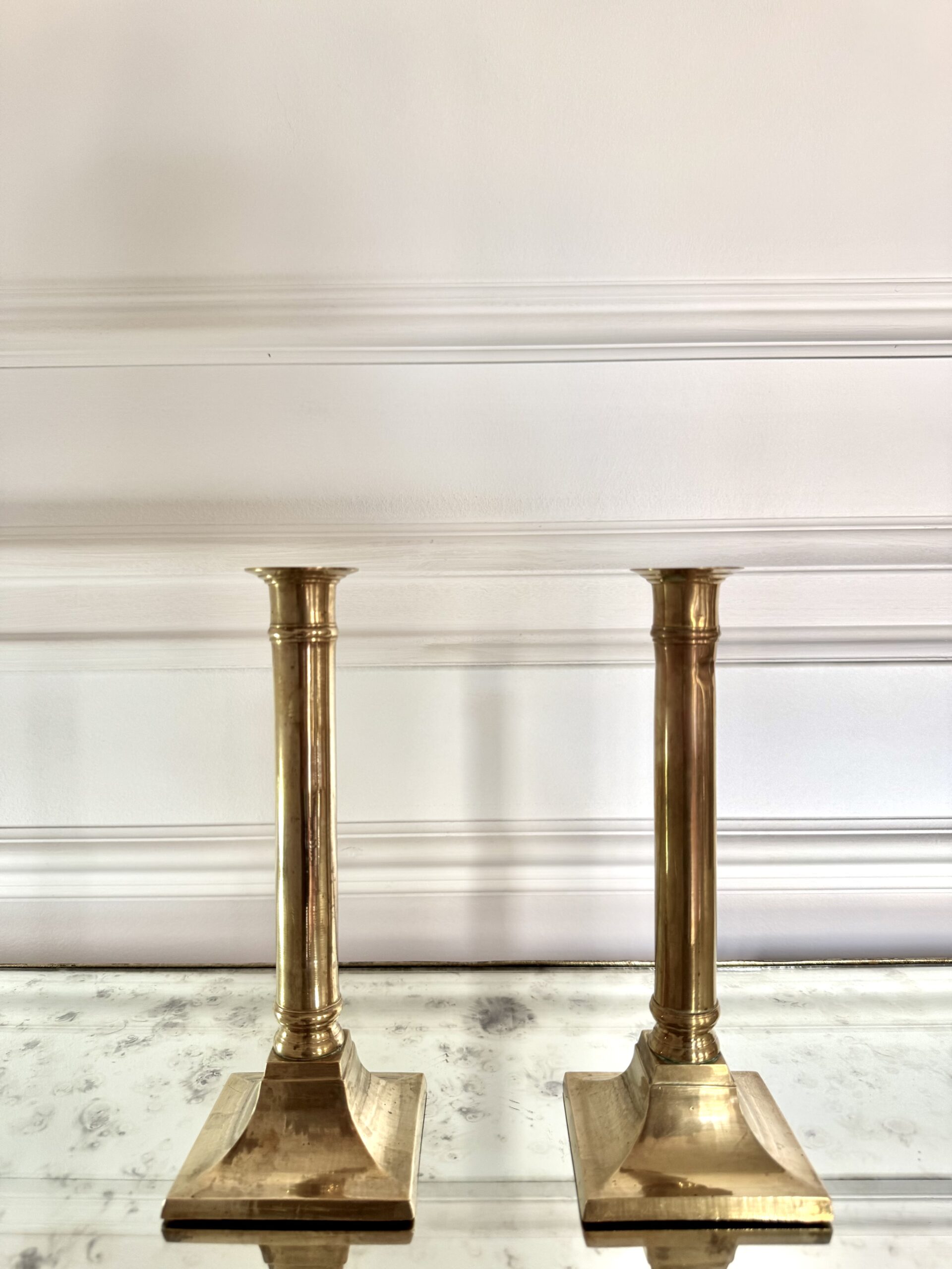 Elegante pareja de candelabros de líneas sobrias y proporciones equilibradas, realizados en latón pulido. Su diseño, inspirado en modelos neoclásicos, combina un fuste cilíndrico liso con una base cuadrada escalonada que aporta estabilidad y presencia. Gracias a su sencillez y al brillo cálido del latón, estas piezas resultan muy versátiles y se integran con naturalidad tanto en interiores clásicos como en espacios contemporáneos.